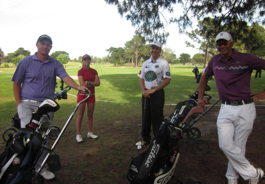 Ben Hollis, India Matthews, Peter Trudgian and Ashley Cameron waiting to hit off the 10th tee | After the round | after the round 2 | ||||||||||||||||||||||||